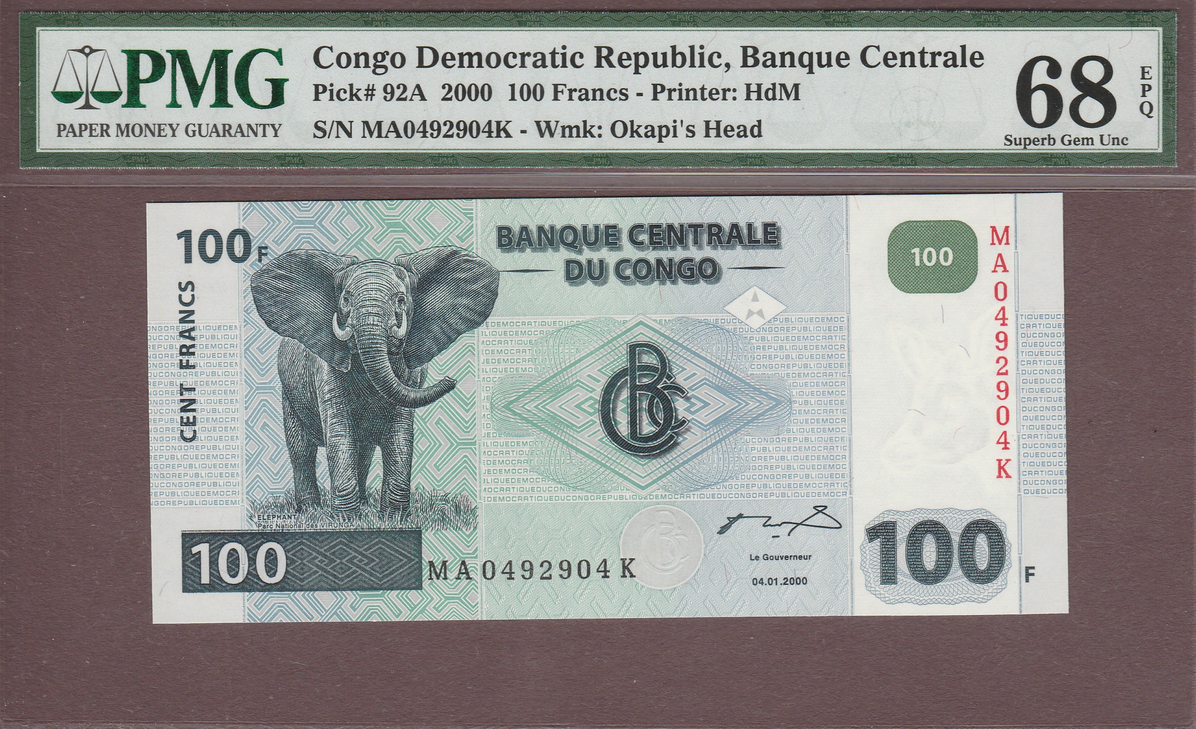 Congo Democratic Republic 04.01.2000 B315d/P92A UNC PMG-68 EPQ