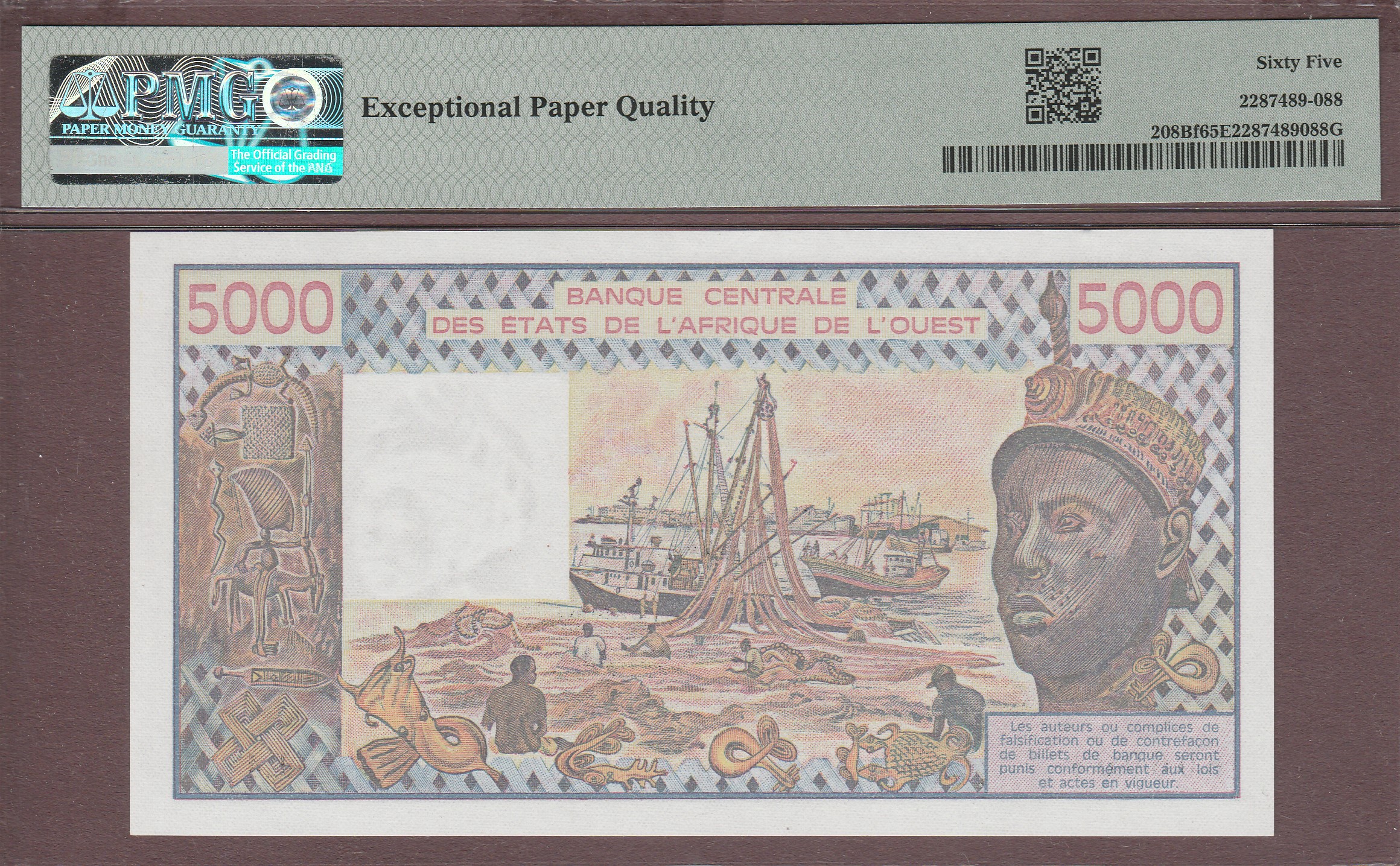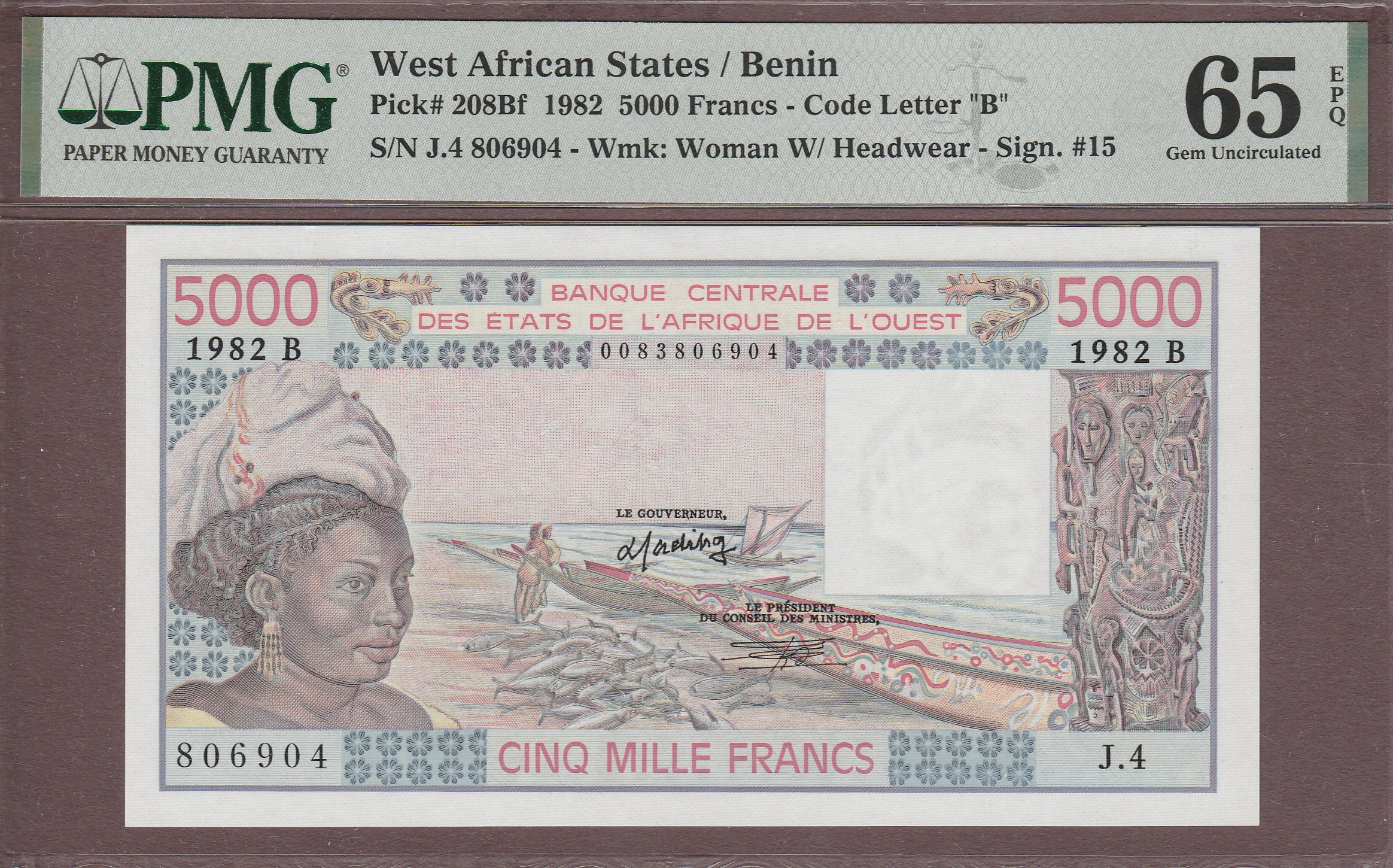 5000 Francs, Benin (letter B), 1982 (better date), B113Bd/P208Bf, UNC PMG-65 EPQ
