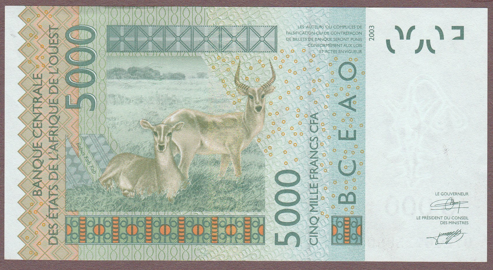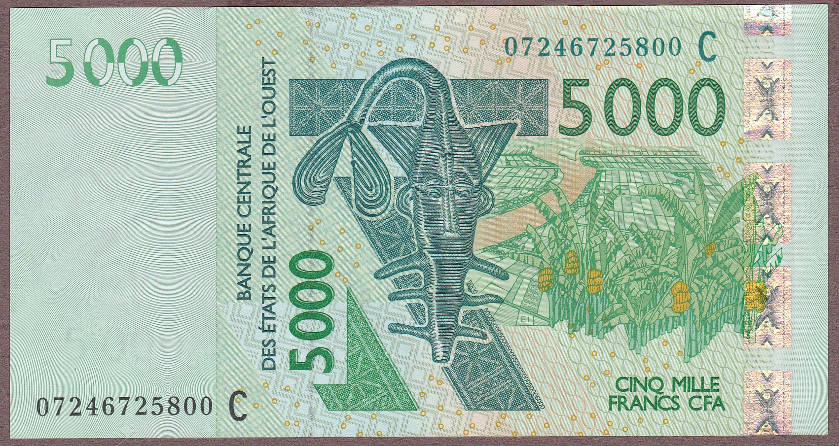 5000 Francs, Burkina Faso (letter C), 2007, signature 34, (uncommon date), B123Ce/P317Ce, UNC