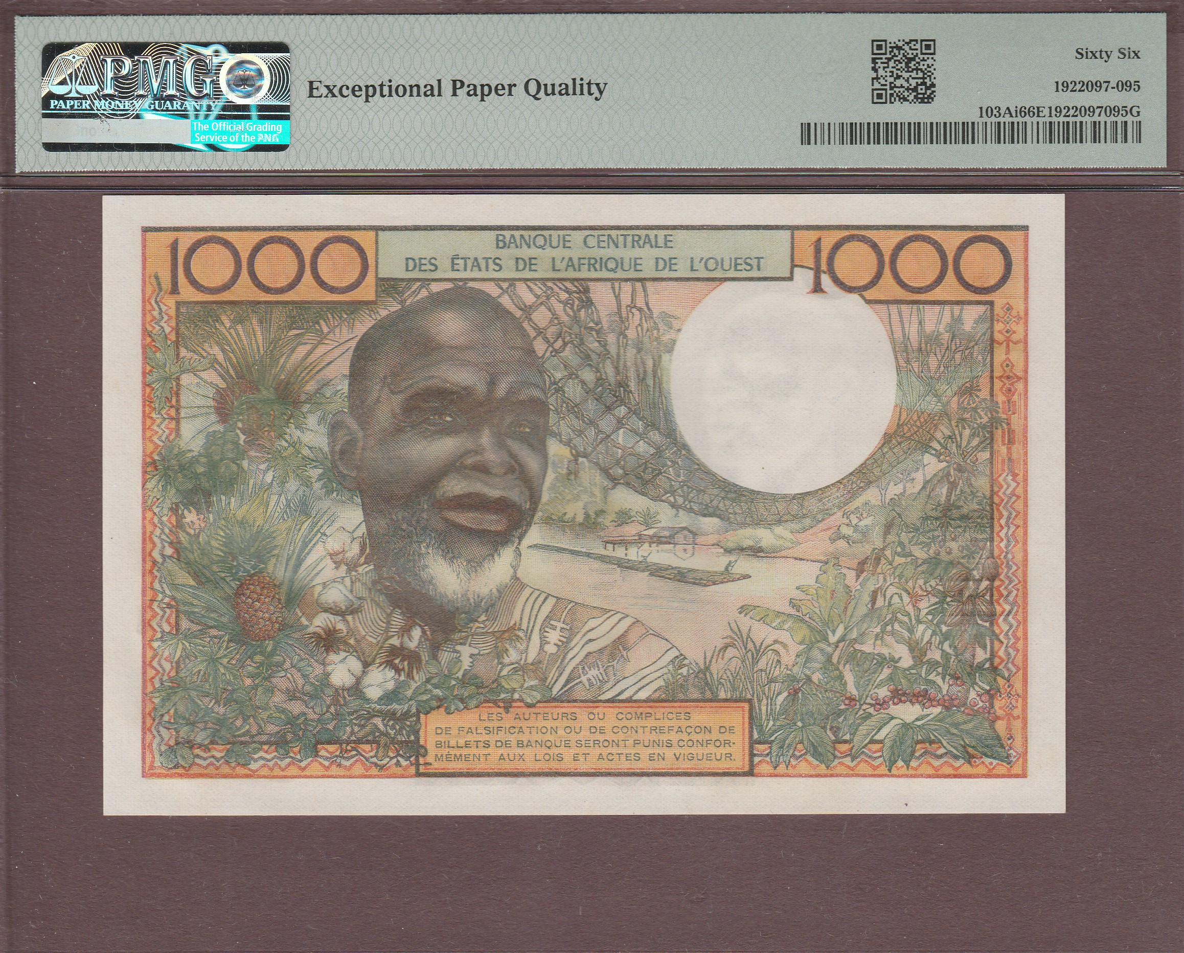 1000 Francs, Ivory Coast (letter A), signature 8, B108Ai/P103Ai, UNC PMG-66 EPQ