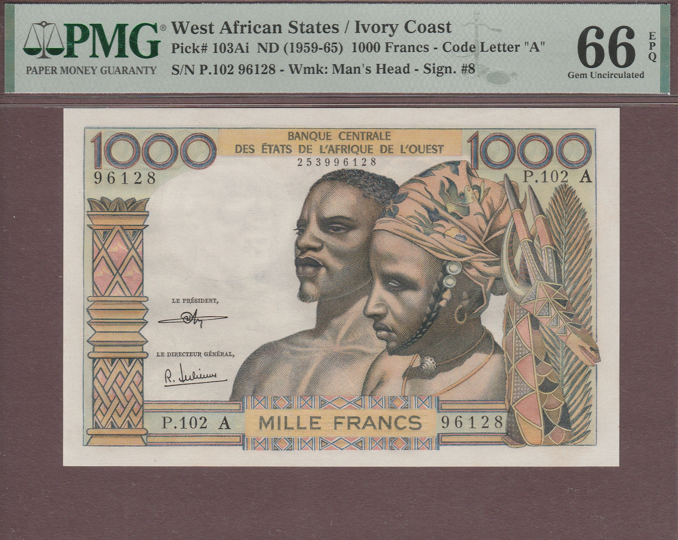 1000 Francs, Ivory Coast (letter A), ND, signature 8, B108Ai/P103Ai, UNC PMG-66 EPQ