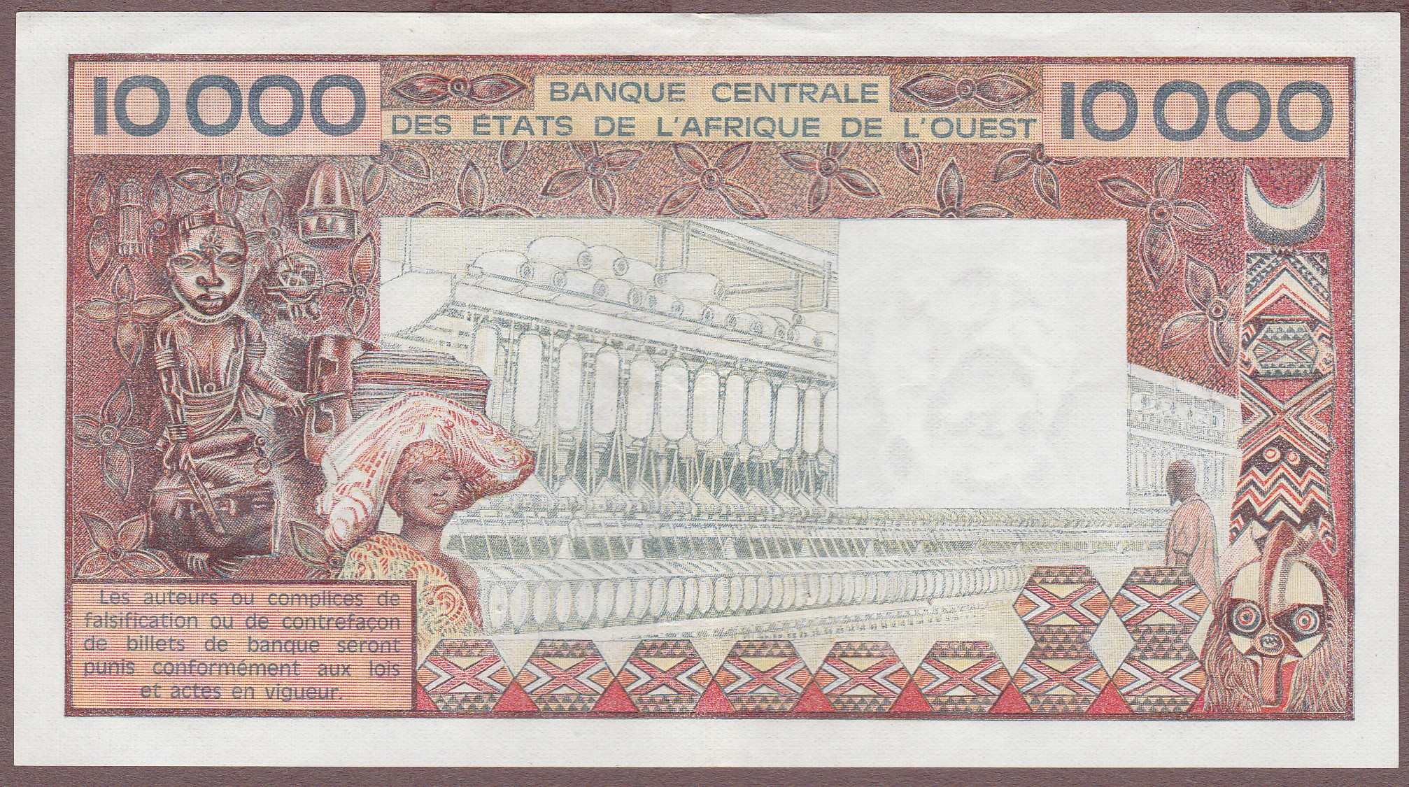 10000 Francs, Ivory Coast (letter A), signature 13/12, B114Ac/P109Ab, XF-AU (pinholes)