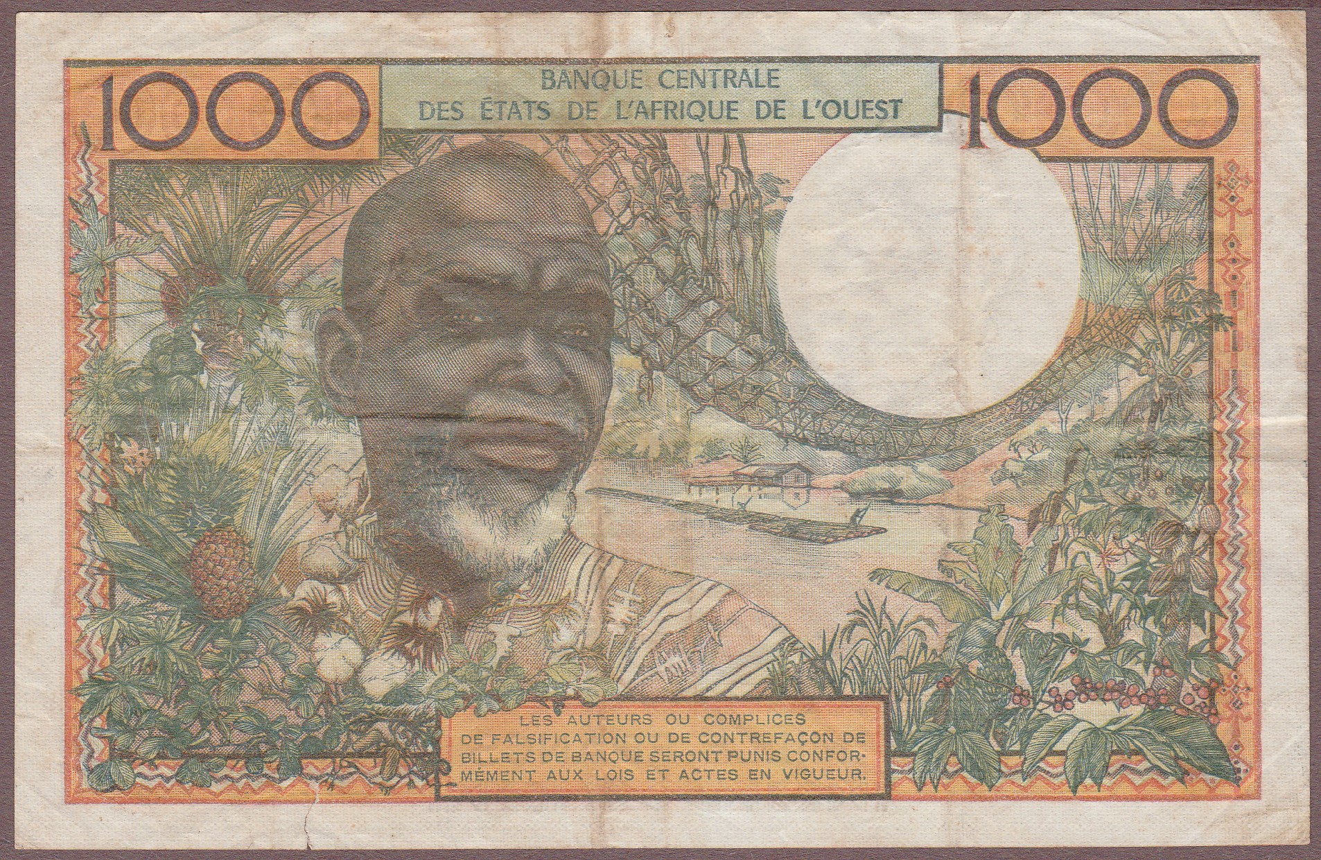 1000 Francs, Senegal (letter K), no date, signature 8, B108Ki/P703Kj, F-VF (tear, soil)