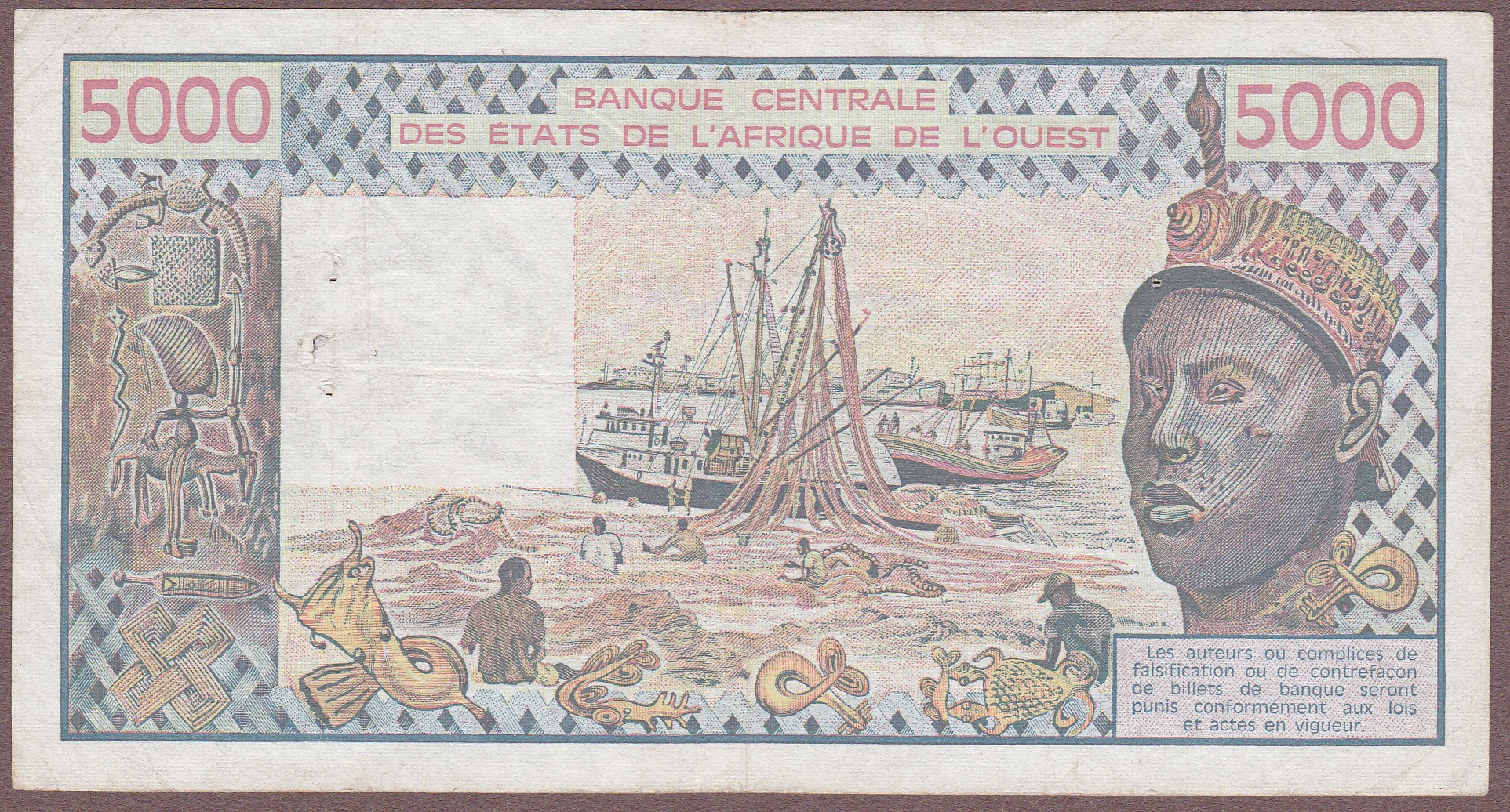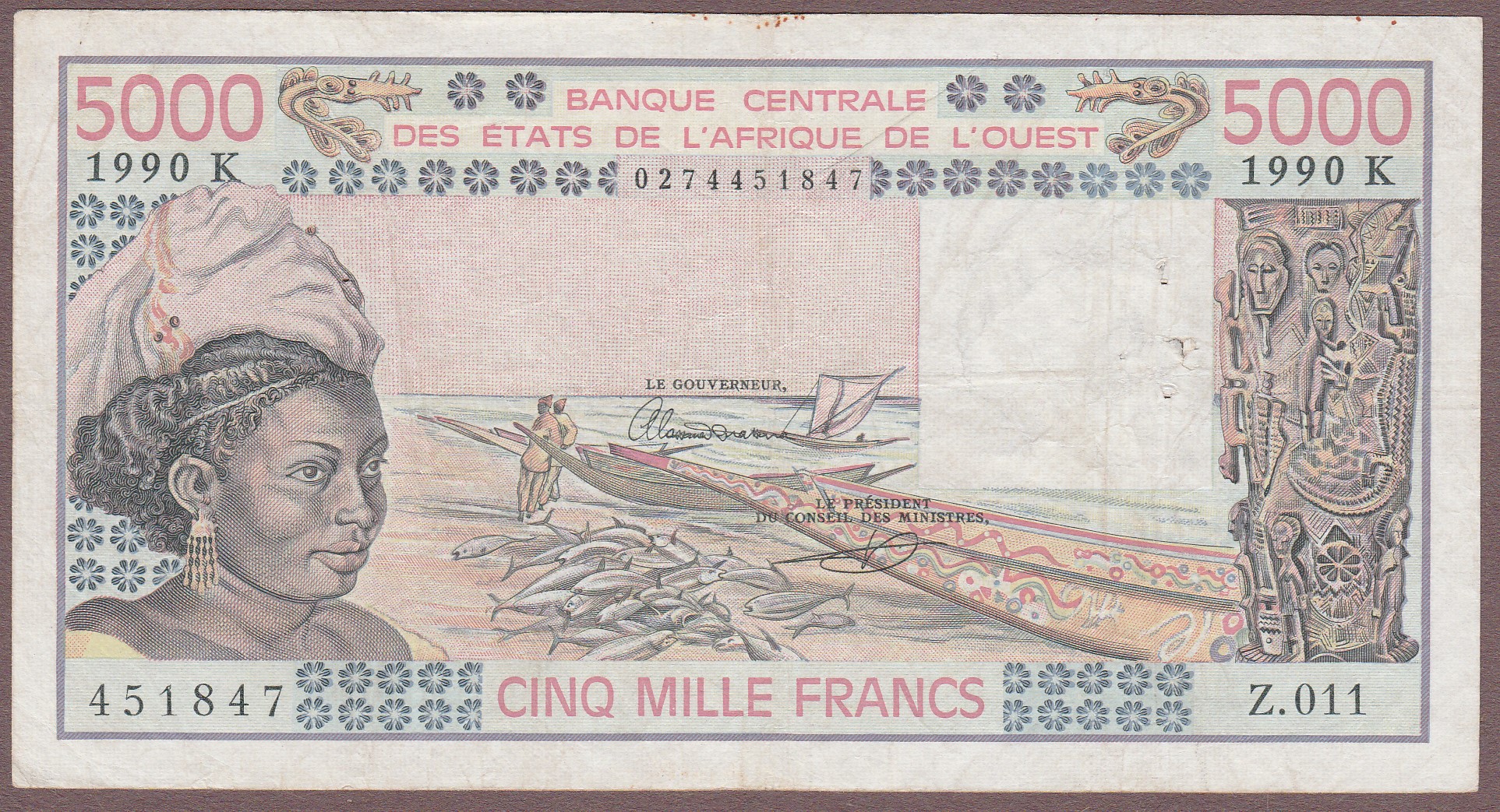 5000 Francs, Senegal (letter K), 1990, B113Kn/P708Km, F-VF (phls)